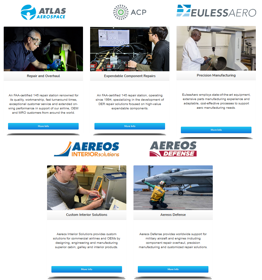 AEREOS es una familia de cinco empresas galardonadas con más de 100 años de servicio, dedicadas a proporcionar piezas de aeronaves de calidad, servicios MRO, y un servicio al cliente excepcional y de gran valor añadido.